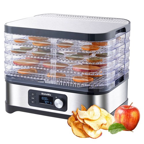 Der BioloMix BD1200 Lebensmitteltrockner verfügt über einen einstellbaren Timer und Temperaturfunktionen; die Trocknungstemperatur kann von 35 bis 70 Grad Celsius eingestellt werden, während die Zeit von 0 bis 24 Stunden eingestellt werden kann. Sie können je nach Zutaten die optimale Zeit und Temperatur wählen. Ein Heißluftventilator schaltet sich automatisch ein und aus, um die Temperatur auszugleichen.