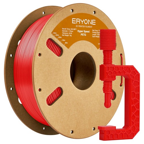Mit dem 1,75 mm HighSpeed PETG-Filament von ERYONE können Sie bei optimalen Einstellungen ohne Probleme mit Stringing und Verformungen drucken. Extrusions-/Düsentemperatur: 240 °C–280 °C, Heizplatten-/Bett-/Plattformtemperatur: 75–80 °C, Geschwindigkeit: 30–500 mm/s.