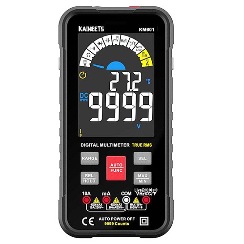 Mehrere Funktionen: Das intelligente Multimeter von KAIWEETS kann AC/DC-Spannung, AC/DC-Strom und 10-A-Strom genau messen und kann auch zum Testen von Durchgang, Kapazität, Frequenz, Arbeitszyklus, Widerstand, Diode, Temperatur, NCV und stromführenden Leitungen verwendet werden. Mit diesem intelligenten digitalen Voltmeter können Sie elektrische Probleme in der Industrie, im Fahrzeug und im Haushalt lösen.